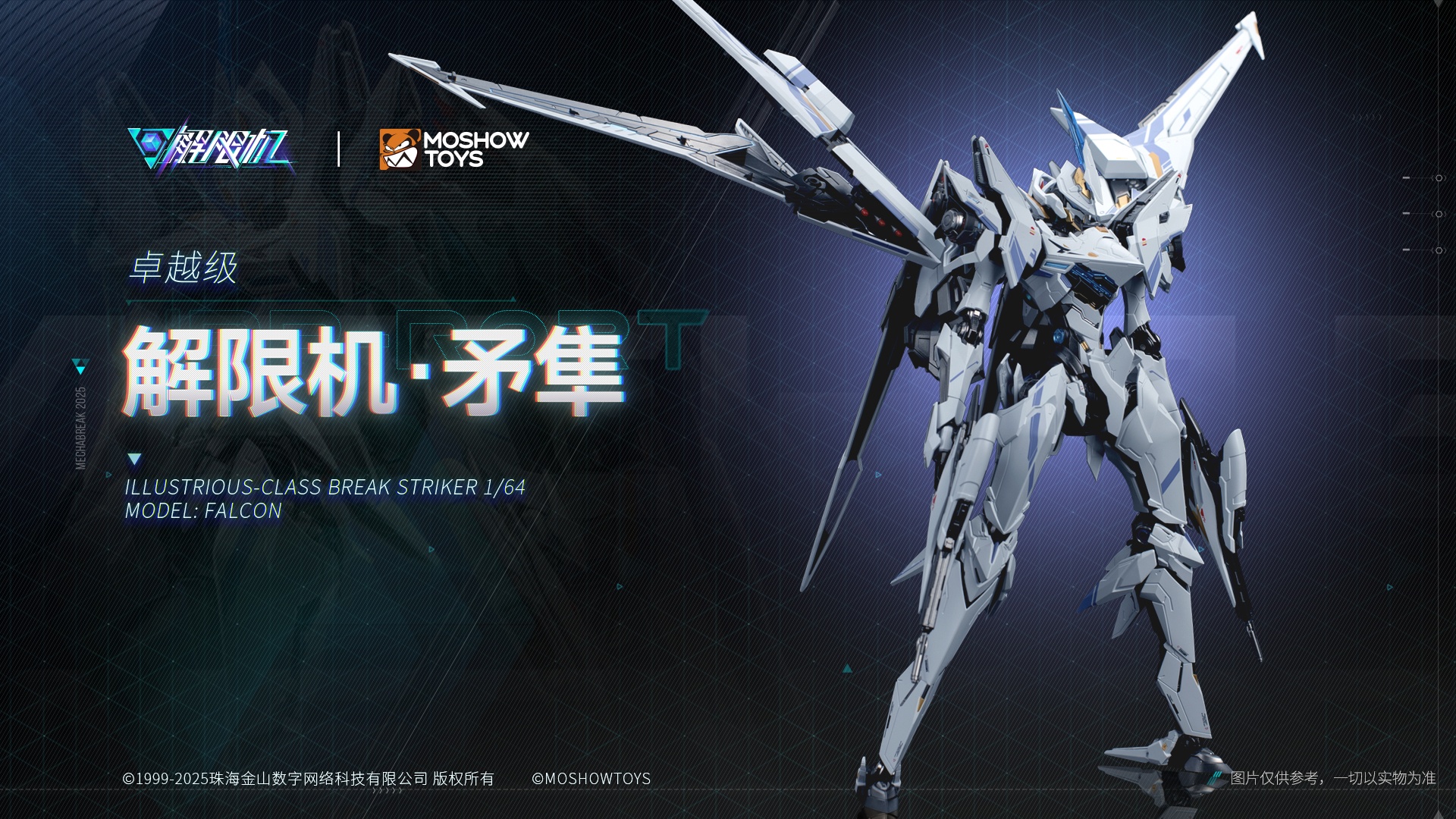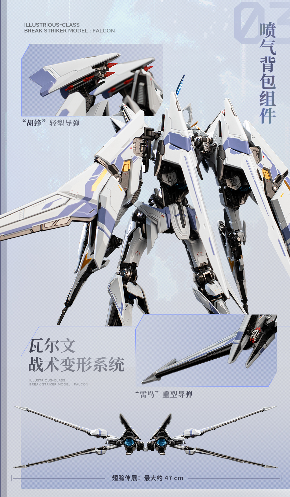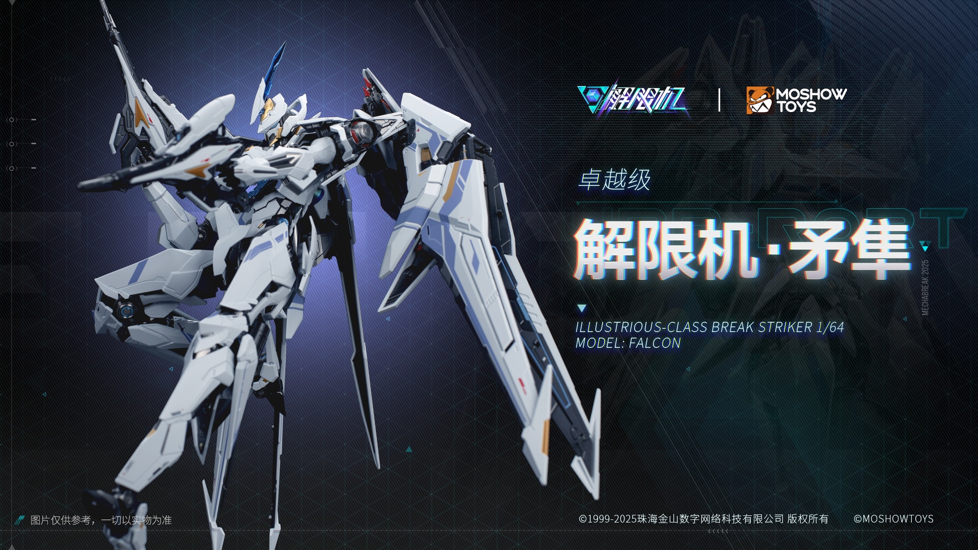 The Falcon is the reconnaissance variant of the Valvravn Striker from the Mecha BREAK universe—standing roughly 23 cm tall, with a striking blend of plastic and alloy die-cast parts for added heft . Its elegant transformation and jet-inspired silhouette are standout features
