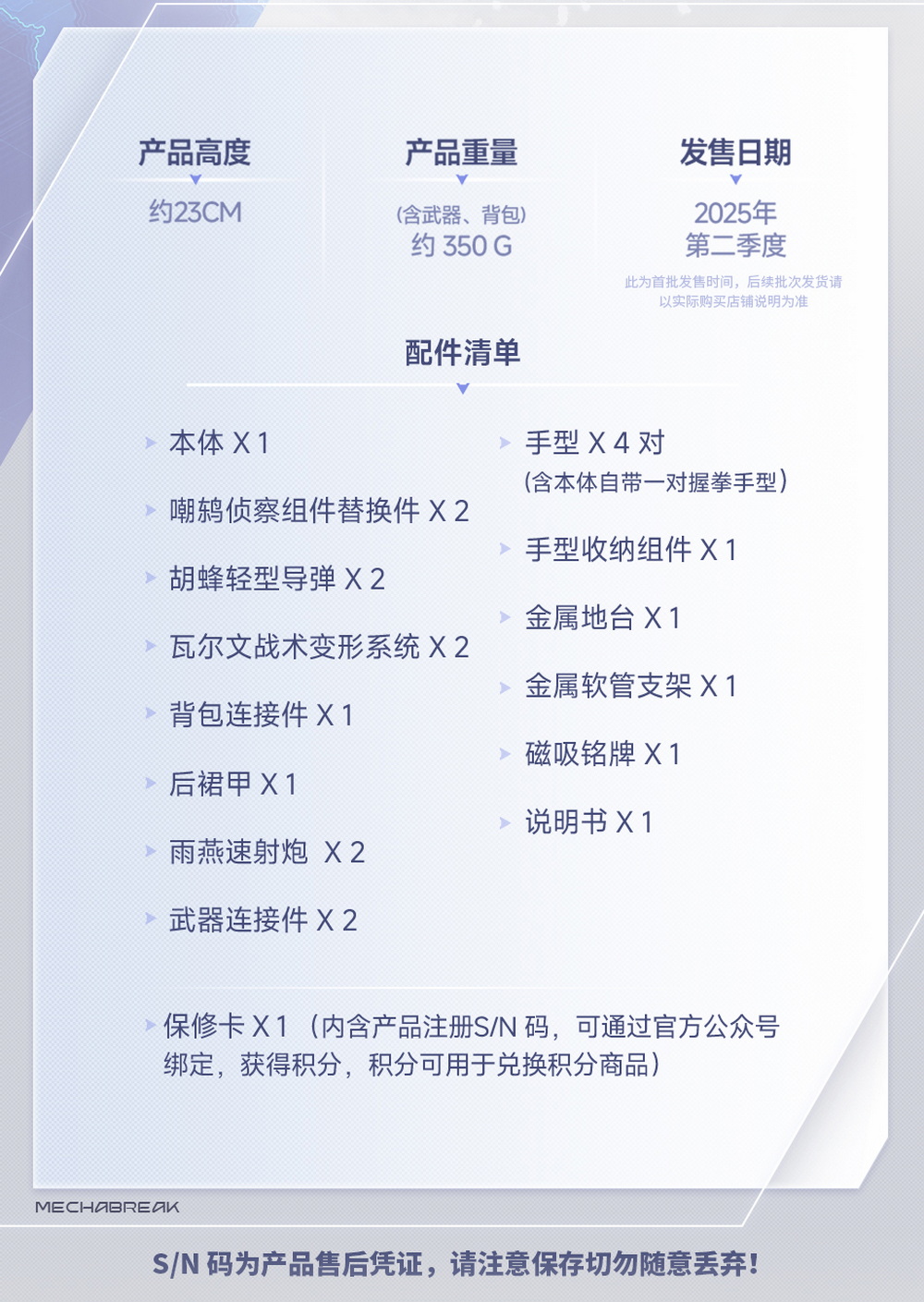 – The Mecha BREAK FALCON Standard Type is a meticulously crafted mech toy featuring a Main Body, “Thrush” Reconnaissance Components, “Wasp” Light Missiles, and more. It includes advanced tactical systems like the “Valwen” Transformation System and “Swift” Rapid-Fire Cannons. The set also comes with multiple hand types, armor, and a metal base for display. Ideal for enthusiasts and collectors.