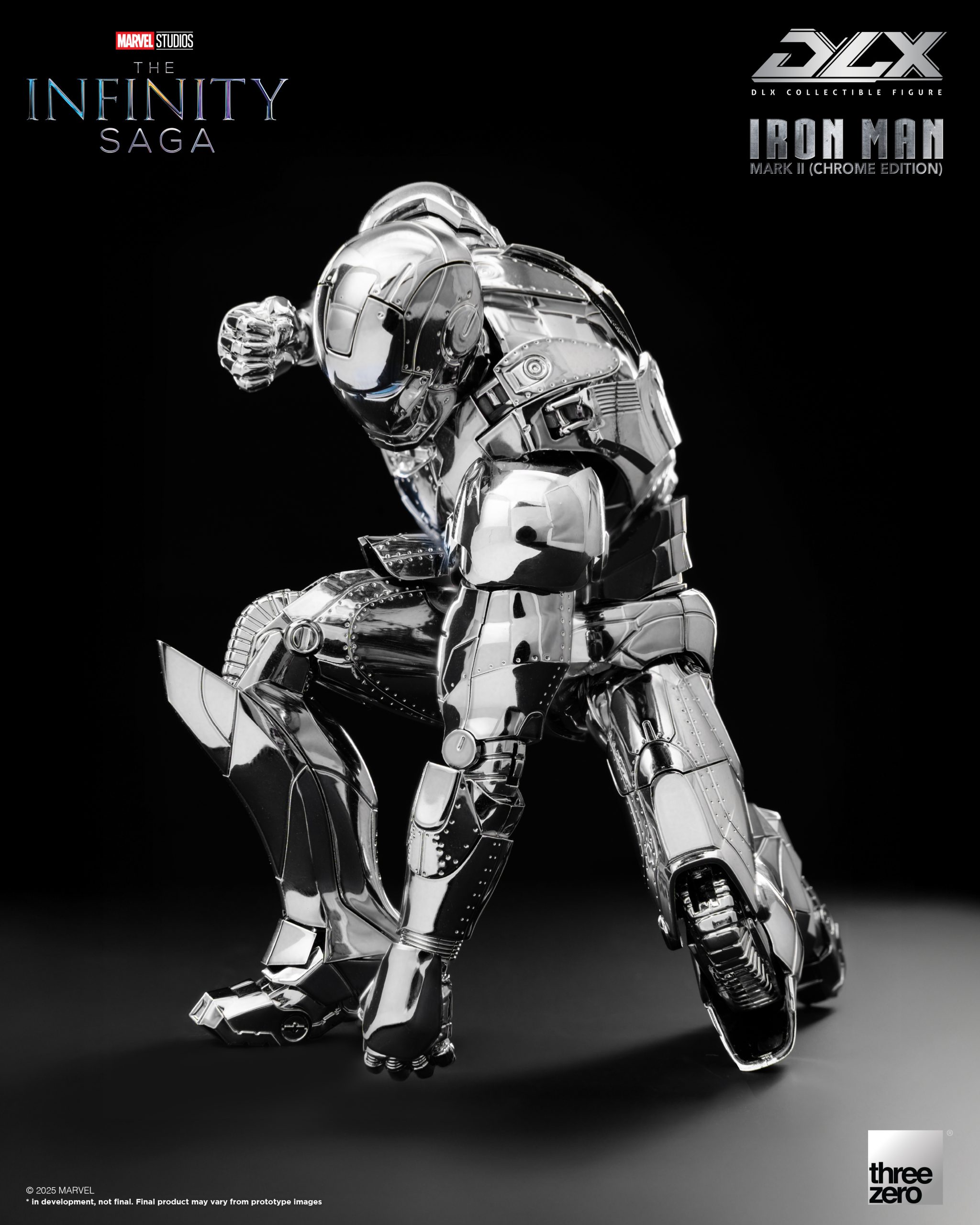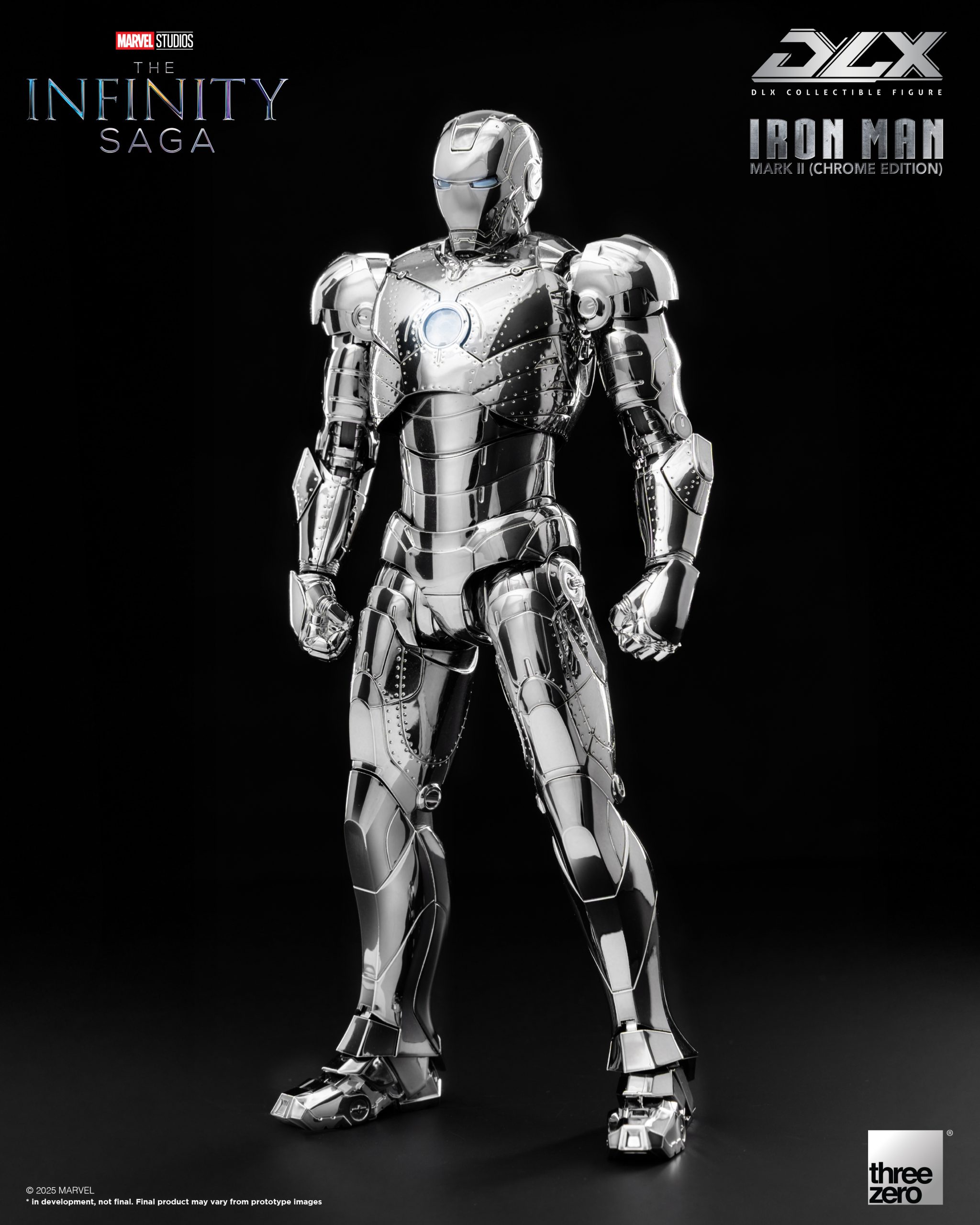 – Special chrome-plating with a highly-reflective metallic sheen replicating the appearance of the titanium alloy armor, threezero’s renowned DLX die-cast system